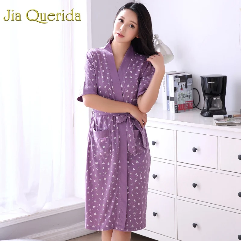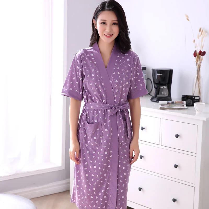 HOT Sale Robe Women's Summer Short Sleeves Bathrobe Plus Size Bath Robe Belted Women Kimono Lavender Floral