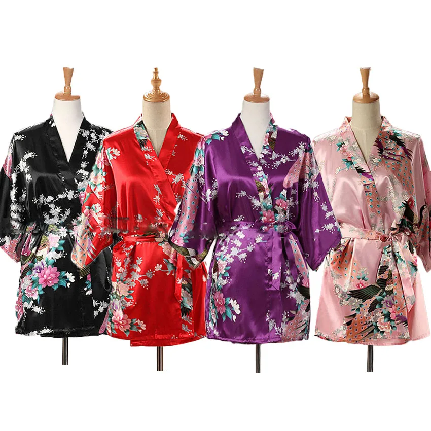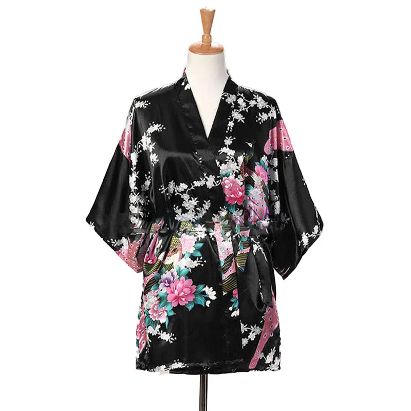 BEST QUALITY Lace Up Woman Peacock Print Japanese Kimono Yukata Silk Satin Short Style Sleepwear Home Nightgown